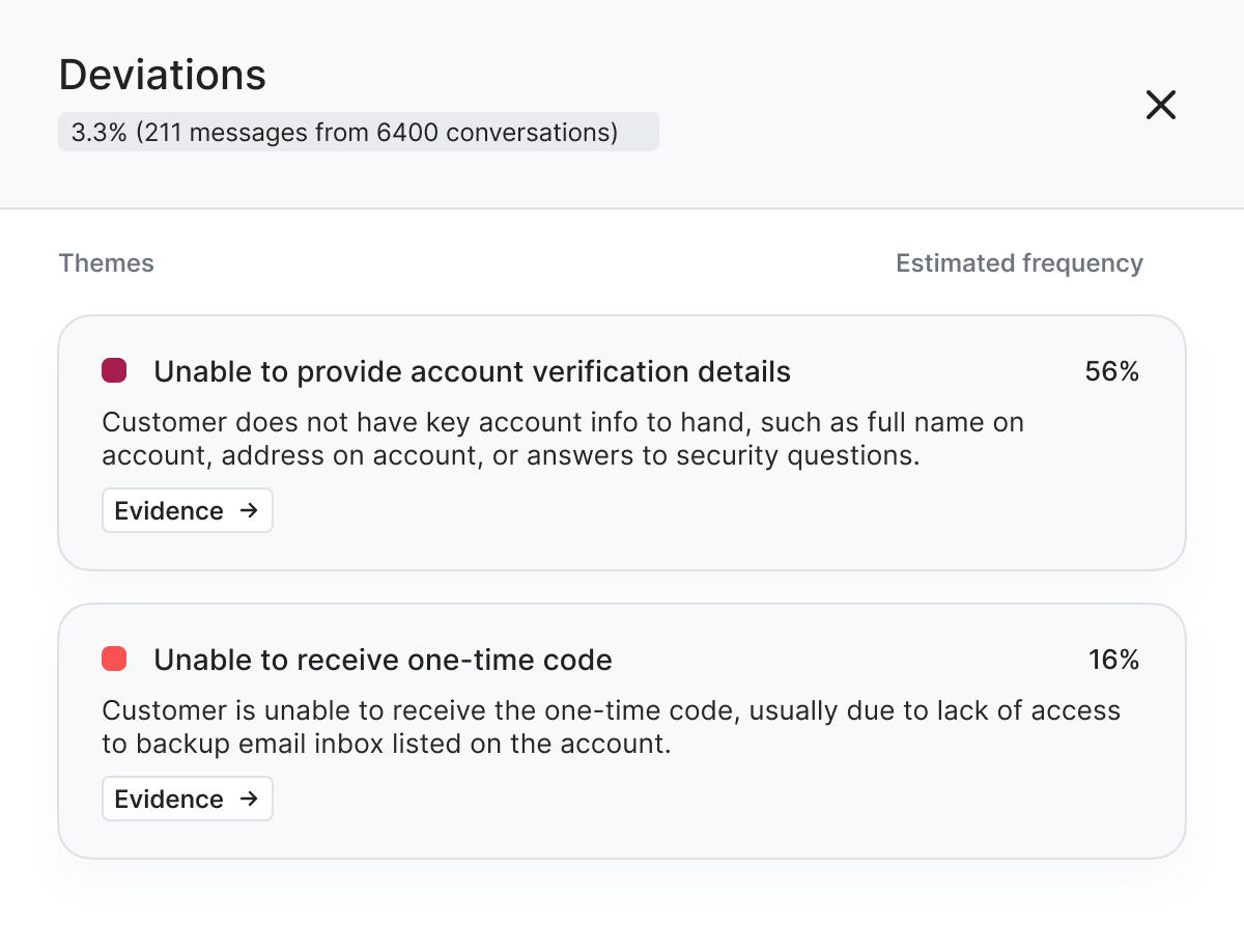 Each deviation is grounded in real conversation examples. Users can inspect these to determine whether a pattern is noise or a true automation blocker, such as a policy exception, handoff, or system failure. This helps teams move from seeing variation to understanding it and deciding what needs to be handled in automation.