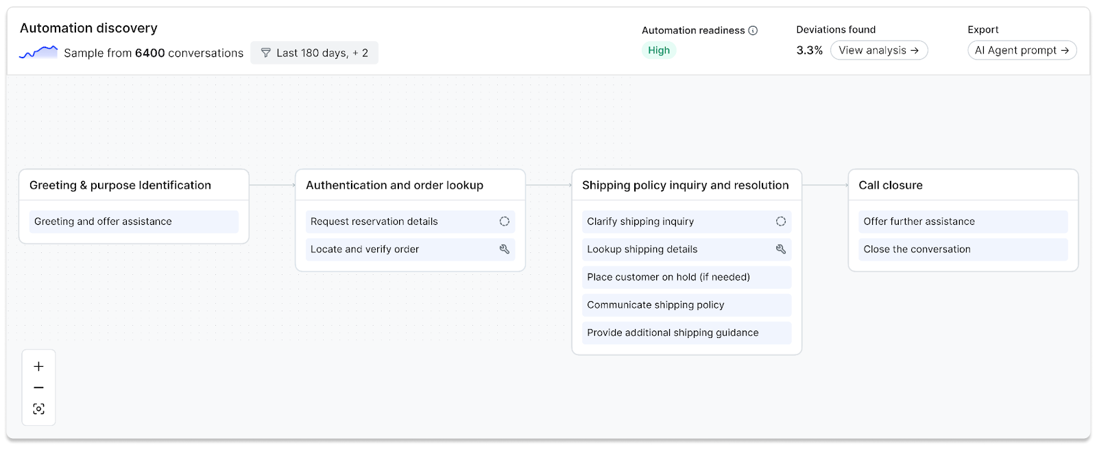 Automation Discovery pulls that structure from customer interactions and reveals the conversation flow path, where these paths could deviate, and why certain workflows are better candidates for automation. For automation, teams can use this blueprint to design agents, define workflows, and plan required integrations.