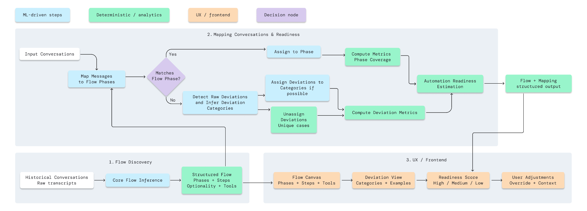 At a high level, the system performs three tasks: it infers a core conversation flow from conversation transcripts, measures how real conversations adhere or vary around that workflow, and estimates automation feasibility from the resulting structural signals.