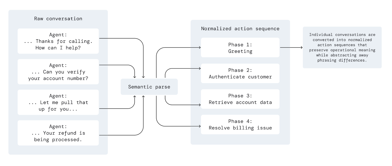 This abstraction layer matters because raw conversations contain enormous stylistic variation. Different agents may phrase the same step differently, or combine multiple steps into a single utterance. The system needs to normalize those surface differences without discarding operational meaning.