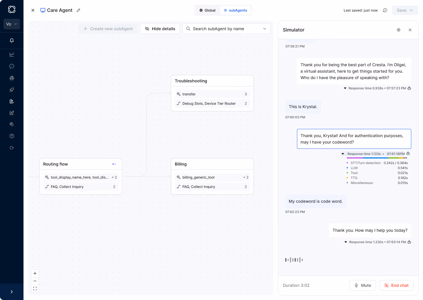 - Make a simulated call using your telephony / WebRTC media path to the AI agent,